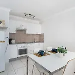 The apartment is equipped with a bathroom that features a hair dryer, toiletries, and bath sheets.